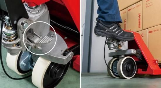 NEシリーズのハンドリフトは新開発タイヤを採用し、始動抵抗や走行抵抗を大幅に低減。そのため、操作がスムーズで効率的な作業が行えます。また、足踏みペダルも標準装備されており、疲労を軽減しながら作業をスムーズに進めることができます。
